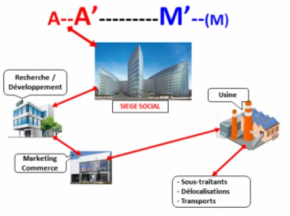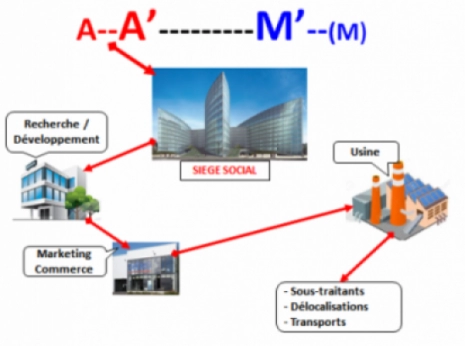 Le cycle formalisé reprend bien la logique financière mis en préalable à tout nouvel investissement de l’entreprise. En d’autres termes il n’y aura d’investissement réalisé A que si et seulement si, je suis sûr de pouvoir récupérer A’. Pour cela les chercheurs sont au premier rang de la financiarisation, puisque leur travail consiste à trouver le produit M’, dont les spécificités techniques et le prix vont garantir la réalisation effective de A’. Nous sommes là dans la « recherche développement vente ». Une fois fixé le produit et son prix, à ce moment-là seulement, commence la réalisation effective du bien (production) M, par ailleurs mis entre parenthèse, car pouvant être sous-traité ou délocalisé (Chine). Marx fut le premier à voir cette possible dérive du capitalisme : « « C’est parce que l’aspect argent de la valeur est sa forme indépendante et tangible, que la forme A-A’, dont le point de départ et le point d’arrivée sont de l’argent réel, exprime de la façon la plus tangible l’idée ‘faire de l’argent, principal moteur de la production capitaliste. Le procès de production capitaliste apparaît seulement comme un intermédiaire inévitable, un mal nécessaire pour faire de l’argent. C’est pourquoi toutes les nations adonnées au mode de production capitaliste sont prises périodiquement du vertige de vouloir faire de l’argent sans l’intermédiaire du procès de production »