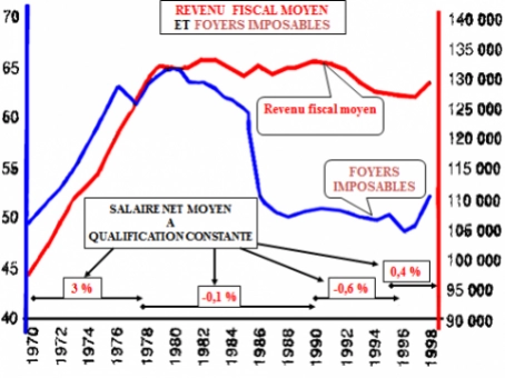 LE DEBUT DE L’INJUSTICE FISCALE : Tout au long des « trente glorieuses », le produit fiscal augmentait du fait de la dynamique vertueuse fondée sur l’investissement public, les salaires et l’emploi, qui engendrait la croissance. Dans ce cadre, les hausses de cotisations ou d’impôts étaient indolores, puisque les salaires augmentaient. A ce moment-là, le revenu fiscal moyen augmentait (graphique) Avec la Crise du dollar de 1971 et surtout avec les politiques de rigueur mises en place à partir de 1983 (désinflation compétitive), on observe la stagnation du revenu fiscal moyen (courbe rouge) et la chute du nombre de ménages assujettis (courbe bleue), du fait de la paupérisation salariale imposée (salaire net moyen). Cette politique débouche sur une concentration de l’impôt sur le revenu sur les classes moyennes, le montrant comme un impôt injuste, alors que dans la réalité, cette situation est la conséquence des politiques économiques et non du système fiscal. Bien sûr il faudrait approfondir l’analyse mais ce n’est pas l’objet.