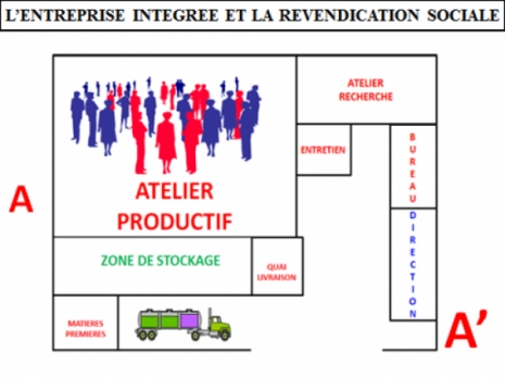 L’ENTREPRISE INTEGREE DU CAPITALISME INDUSTRIEL : Le capitalisme fonctionnait alors selon une logique industrielle qui s’appuyait sur « l’entreprise intégrée ». L’entreprise intégrée est une entreprise où toute l’activité se retrouve concentrée dans un même espace-temps, comme tente de le visualiser, le schéma. Tout, à part les matières premières, était alors conçu, fabriqué et exécuté au sein de l’entreprise. Les bureaux et cols blancs côtoyaient les cols bleus des ouvriers de l’atelier, sans avoir à s’envoyer des « mails » ou le T.G.V pour se rencontrer. Observons que dans cette construction, la revendication syndicale était plus facile à construire, car tout ce qui était fait dans l’entreprise était connue.