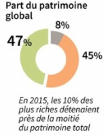2] Remise en cause des inégalités de système : Depuis une trentaine d’années, les politiques mises en place et appliquées (les profits individuels comme condition du développement général) [7] n’ont fait que développer les inégalités et notamment les inégalités de revenus comme le montre le graphique ci-dessous. Où l’on observe que comme pour les baisses d’impôt, ce sont les revenus les plus élevés, qui ont connus la hausse la plus importante. De plus, comme le montre le graphique de droite, c’est l’accumulation des revenus les plus élevés qui créent le patrimoine, qui par la suite s’accumule, développant encore plus les inégalités sociales. Ces inégalités de patrimoine qui se développent ne sont pas naturelles, elles sont le produit d’un système. Elles sont une violence contre la société. Et de tout temps, comme l’écrivait déjà Victor Hugo : « c’est du malheur des pauvres, qu’est fait le paradis des riches ».