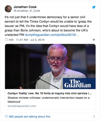 Bien que l’antisémitisme soit devenu la bâton de prédilection pour battre Corbyn, d’autres types d’attaque font régulièrement surface. La dernière en date, ce sont des commentaires de « haut fonctionnaires » anonymes rapportés par le Times qui prétendent que Corbyn serait trop fragile physiquement et mentalement mal armé pour saisir tous les détails nécessaires à l’exercice de la fonction de Premier Ministre. Peu importe que le commentaire ait été fait par un haut fonctionnaire ou tout simplement concocté par le Times. C’est une preuve de plus des efforts anti-démocratiques déployés par l’establishment politique et médiatique pour discréditer Corbyn devant l’imminence d’une élection générale.