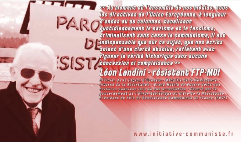 Par Léon Landini Président de l’Amicale des Anciens Francs-Tireurs et partisan de la Main d’œuvre Immigrée des Bataillons Carmagnole- Liberté de la région Rhône-Alpes. (Unité à propos de laquelle Charles Tillon a déclaré : « Carmagnole-liberté, un des plus beaux fleurons, si ce n’est le plus beau fleuron de la Résistance armée française »). Officier de la Légion d’Honneur. Médaille de la Résistance. Interné de la Résistance. Grand Mutilé de Guerre suite aux tortures endurées lors de son arrestation. Décoré par le gouvernement de l’Union Soviétique au titre de la Résistance. Président du Pôle de Renaissance Communiste en France (PRCF)