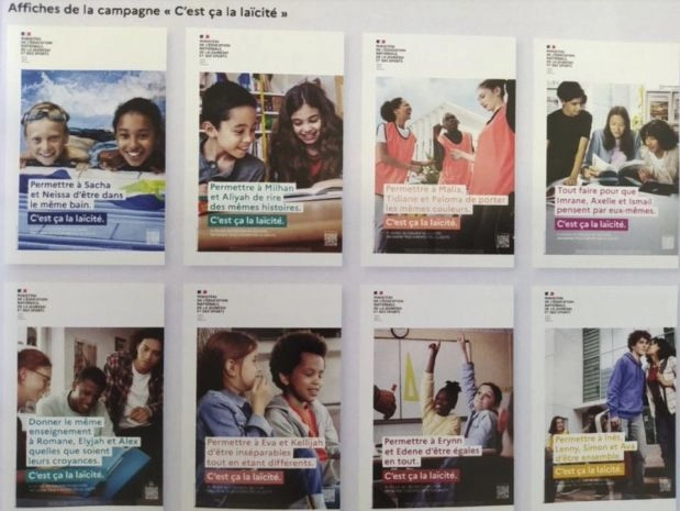 Une nouvelle affiche est apparue dans les abribus ; son slogan : « Tout faire pour qu’Imrane, Estelle et Ismail pensent par eux- mêmes. C’est ça la laïcité », est accompagné d’une image montrant trois jeunes, deux garçons arabo-musulmans (Imrane et Ismail) encadrant une Asiatique (« Estelle »).