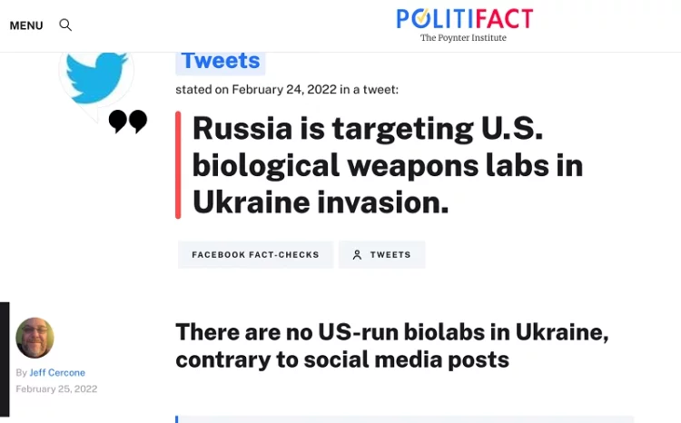 Les affirmations selon lesquelles l’Ukraine possède actuellement des laboratoires d’armes biologiques dangereuses sont venues de la Russie et de la Chine. Le ministère chinois des Affaires étrangères a affirmé ce mois-ci : "Les États-Unis ont sous leur contrôle 336 laboratoires dans 30 pays, dont 26 rien qu’en Ukraine." Le ministère russe des Affaires étrangères a affirmé que "la Russie a obtenu des documents prouvant que des laboratoires biologiques ukrainiens situés près des frontières russes travaillaient au développement de composants d’armes biologiques." De telles affirmations méritent le même niveau de scepticisme que les démentis américains : à savoir qu’il ne faut pas croire que tout cela est vrai ou faux en l’absence de preuves. Pourtant, les vérificateurs de faits américains se sont consciencieusement et par réflexe rangés du côté du gouvernement américain pour déclarer que de telles affirmations étaient de la "désinformation" et pour les tourner en dérision en les qualifiant de théories du complot de Qanon.