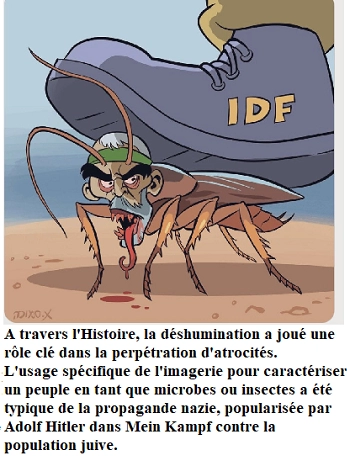 (7) Nous avons pu consulter une étude publiée par le site du Musée du judaïsme, traitant de la bestialisation des juifs par les nazis, mais aussi de « l’antisémitisme des Arabes ». Paille et poutre, car à aucun moment cette étude ne signale les discours racistes et zoomorphes des dirigeants d’Israël sur les Palestiniens. Ce n’était probablement pas l’objet de cette étude !