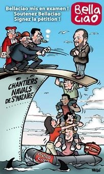 Alors, évidemment, comme ça dérange, certains voudraient bien les faire fermer. C’est ainsi que le site de Bellaciao est en procés avec les Chantiers Navals de Saint-Nazaire pour avoir diffuser une note de la CGT, parue dans la presse traditionnelle, dénonçant les conditions de travail honteuse, ressemblant à de l’esclavage et au mépris du Droit du Travail, de treize ouvriers polonais. Le comble est que le plaignant, les Chantiers Navals, ne nie pas les faits dénoncés mais seulement les mots employés pour le dire, qui sont de la responsabilité de la CGT. Alors, au lieu de s’en prendre à Goliath, la CGT, les Chantiers Navals s’en prennent à David, Bellaciao par l’intermédiaire de Roberto Ferrario. Il est quand même assez époustouflant de se retrouver avec un procés sur le dos pour avoir simplement diffuser une information et se battre pour la liberté d’expression.