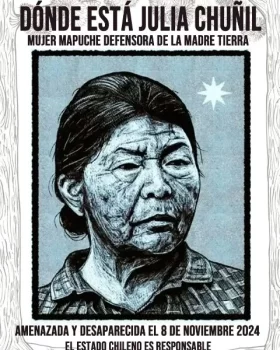 Le 8 novembre 2025 marquera un an depuis la disparition de Julia Chuñil Catricura, 72 ans, dirigeante mapuche et présidente de la communauté de 17 familles de Putreguel (Région de Los Ríos, Chili). Malgré les promesses des autorités chiliennes, aucune avancée significative n'a été enregistrée dans l'enquête. L'association Al Sur exige que toute la lumière soit faite sur cette disparition et que justice soit rendue.