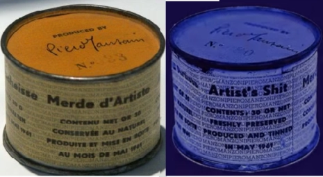 Cet artiste italien, peintre de monochromes blancs, a voulu se rapprocher de Klein qu’il considérait comme son égal. Mais celui-ci, ne pouvant admettre la concurrence d’un autre monochromiste, l’envoya balader. Chacun en sa chacunière ! Manzoni en fut modérément affecté, il acheta 90 boites de conserves et il les fit sertir après avoir déposé dans chacune 30 grammes d’excréments de sa production. Succès commercial ! L’une d’elle fut payée avec 30 grammes d’or !