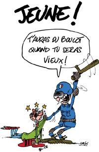 Le galouzis parle de donner leur « chance » aux jeunes, mais ici l’ironie galouzesque atteint son comble, car on ne voit pas quelle chance constitue pour un jeune la perspective d’être éjecté à tout moment de son poste de travail, de bénéficier d’une éducation au rabais, d’être soumis aux quatre volontés de son employeur, de n’avoir pour seul projet dans l’existence que de conserver un emploi précaire, et de mener une vie où l’angoisse de tout perdre côtoie l’humiliation de se voir licencier sans motif, comme on se débarrasse d’un vêtement qui ne plaît plus.