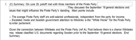 Je ne suis pas sur le point de récapituler tout le cauchemar juridique de Julian Assange avec la Suède, mais il est important de comprendre que ce qui s’est passé en août 2010 a très probablement été un piège monté par le gouvernement US pour empêcher Assange de publier d’autres documents (note : voir justice4assange.com pour plus d’informations sur l’affaire). Le 11 août 2010, moins de deux semaines après qu’Alan Rusbridger du Guardian ait signé un accord pour ne pas publier ou partager Cablegate sans le consentement d’Assange, Julian Assange est arrivé en Suède pour quelques jours seulement. À un moment donné, il a rencontré des représentants du Parti Pirate Suédois qui avait accepté d’héberger les serveurs de WikiLeaks et, fait intéressant, on a récemment appris que l’ambassade US a également rencontré des membres du Parti Pirate Suédois moins de deux semaines avant l’arrivée dAssange. Cette information a été révélée par un câble découvert dans l’ordinateur portable d’Anthony Weiner.