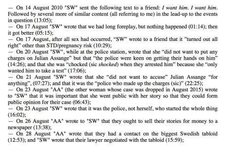 Comme nous le savons tous, Assange a eu des relations sexuelles consensuelles avec une femme (SW) pendant son séjour en Suède. Quelques jours plus tard et à sa demande, il a accepté de la rencontrer à l’hôpital pour passer un test de dépistage de MST. Cependant, avant que cette rencontre ait pu avoir lieu, SW a décidé, bizarrement et à l’insu d’Assange, de le dénoncer à la police. Une autre femme avec laquelle Assange avait couché pendant son séjour en Suède, AA, accompagna SW au poste de police. Une enquête fut ouverte pour agression sexuelle sur SW et pour viol sur AA - alors que cette dernière avait déclaré à la police que les rapports sexuels avaient été consentis. Le procureur adjoint a d’abord demandé l’arrestation d’Assange, mais moins de vingt-quatre heures plus tard, le procureur général de Stockholm a annulé le mandat d’arrêt, faute de preuves.