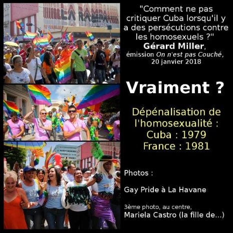 C’est ainsi que le 20 janvier 2018, lors de l’émission On n’est pas couché, Gérard Miller prononça cette phrase somme toute empreinte d’un certain bon sens : « Comment ne pas critiquer Cuba lorsqu’il y a des persécutions contre les homosexuels ? ». Pas de quoi s’énerver, sauf si votre détecteur de « Bullshit » (grosse connerie manifeste) est poussé à fond. Et moi, lorsque j’entends une phrase qui contient le mot « Cuba », mon détecteur de « Bullshit » personnel entre en surchauffe en émettant un sifflement strident.