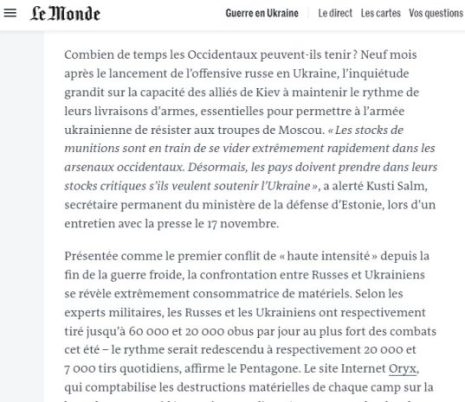 Quoi que nous racontent les médias dans leur propagande habituelle à l’encontre de la Russie, celle-ci poursuivra cette ‘guerre’ et imposera les objectifs qu’elle a clairement annoncé dès le début : la dénazification de l’Ukraine, sa démilitarisation et le recul de l’Otan – sinon sa désintégration – aux frontières fixées par Moscou. Et ce, quels que soient les moyens mis en œuvre par l’ensemble des nations occidentales principalement, pour tenter de l’écraser. Avec ce danger qui croît chaque jour : plus ces moyens mis en œuvre pour la contrer sont importants, plus les pays qui y participent s’exposent à des représailles de sa part, et là aussi, le Kremlin ne cesse de les avertir.