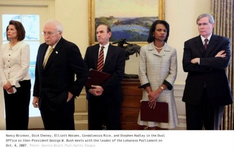 Par contre, lorsque l’Iran fit une offre de paix en 2003, peu après l’invasion de l’Irak par les États-Unis, il semble bien qu’Abrams ait joué un rôle dans l’histoire de son étouffement. Le fax de la proposition était destiné à Condoleeza Rice, qui conseillait alors Bush en matière de sécurité nationale, mais il devait d’abord passer par Abrams. Pour une raison ou pour une autre, il n’atterrit jamais sur le bureau de Rice. À une question qui lui fut posée plus tard le sujet, le porte-parole d’Abrams répondit qu’il « n’avait pas le moindre souvenir d’un fax de cette nature ». (Nombreux sont ceux qui, comme Abrams, évoluent comme des poissons dans l’eau aux échelons les plus élevés du monde politique, mais souffrent d’une mémoire labile pour tout ce qui touche à la politique. En 1984, Abrams affirma devant Ted Koppel qu’il ne pouvait se rappeler avec certitude si les États-Unis avaient déclenché des enquêtes, à la suite des rapports faisant état de massacres au Salvador. En 1986, la Commission Sénatoriale Permanente sur le Renseignement, qui l’interrogeait sur la levée de fonds destinés aux Contras, lui demanda s’il avait eu des discussions à ce sujet, avec un membre quelconque du Conseil National de Sécurité. Là encore, sa mémoire lui fit défaut.)