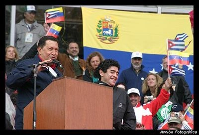 H.C. : Bon, justement, un des pays qui a le plus souffert, le plus souffert, jusqu’aux os, et cela nous fait très mal de le dire, de cette Initiative pour les Amériques, de cette orgie de privatisations, ce fut la grande nation argentine vendue par l’élite argentine. Mais aujourd’hui, l’Argentine se lève à nouveau et porte le drapeau de la liberté ! Vive l’Argentine ! Vive la partrie de San Martin, la patrie du Che, la patrie de Peron, la patrie de Evita, la patrie de nous tous ! Vive l’Argentine ! Argentine, je t’aime !