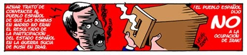 Le régime Aznar a bel et bien envisagé le coup d’Etat : la suspension des élections. Aznar a reculé dans la nuit les précédant, en se déchirant avec ses amis à ce sujet, car s’ils avaient fait cela ils n’étaient pas sûrs de gagner : par millions dimanche matin les électeurs montant aux urnes se seraient heurtés à la Guardia Civil. Ils ont reculé car ayant déjà perdu le bénéfice de l’attentat qu’ils avaient cru pouvoir exploiter, ils allaient perdre tout contrôle et ouvrir une situation quasi insurrectionnelle.