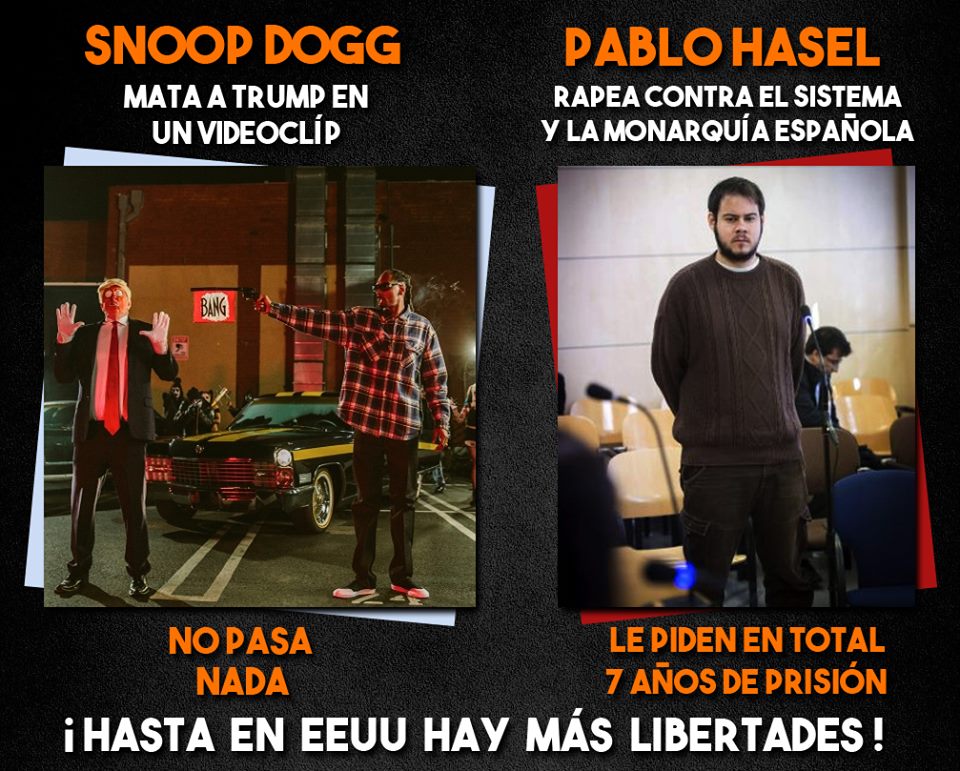 Dans beaucoup d’autre pays qui ne sont pas non plus des démocraties exemplaires on est surpris par l’intensité de la répression et l’absence de liberté d’expression dans l’état espagnol. Pas même aux États-Unis les rappeurs ne sont emprisonnés pour le contenu de leurs chansons (Ndt : par exemple le rappeur Snoop dog qui tue Trump lors d’un clip). Aucun des tortionnaires assassins fascistes du régime de Franco n’a passé un seul jour en prison, cependant il y a désormais un utilisateur de twitter prisonnier et plusieurs rappeurs et utilisateurs de twitter sont en attente de prison, cela veut tout dire.