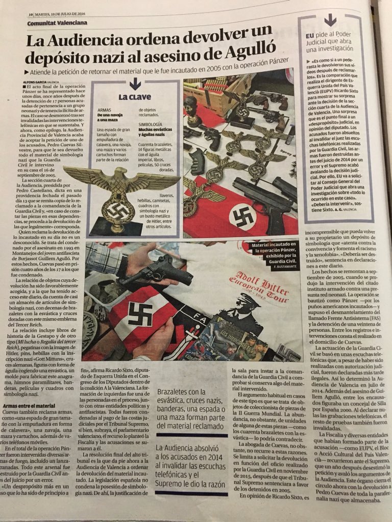 Excepté pour les fascistes et leurs collaborateurs, cela nous affecte tous. Ou nous nous unissons tous pour sortir de l’individualisme et pour lutter pour ce droit (à la liberté d’expression) et beaucoup d’autres droits, ou il continueront à nous écraser. Demain cela peut te concerner pour critiquer la monarchie ou dénoncer la brutalité policière ou désigner les coupables de dénier une vie digne à l’immense majorité. Parce que sans liberté d’expression pour l’antifascisme il ne pourra pas y avoir de démocratie. Je demande que soit diffusé cette vidéo pour qu’elle atteigne le plus possible de personnes, surtout dans les autres pays pour qu’on sache ce qu’il se passe en Espagne.