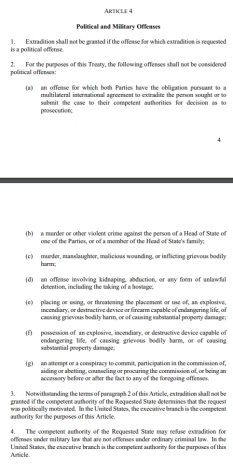 Ces deux derniers jours, la défense a tenté de démontrer de manière rationnelle qu’il s’agit d’une poursuite à motivation politique et qu’elle n’est donc pas éligible aux termes du traité d’extradition conclu entre le Royaume-Uni et les États-Unis en 2007 (extrait pertinent illustré ci-dessus).