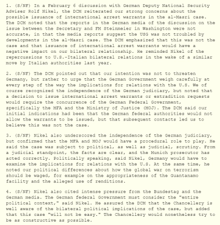 Puis, lorsque les câbles diplomatiquesWikileaks ont été publiés par Wikileaks, ils ont pu constater les pressions exercées sur le gouvernement allemand pour qu’il ne délivre pas le mandat d’arrêt. Les États-Unis avaient dit à l’Allemagne que cela aurait de graves répercussions sur les relations entre les deux pays.
