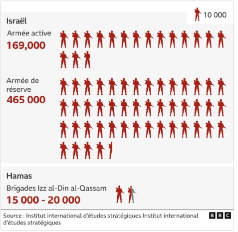 Les USA sont le principal fournisseur en armements et parrain de l’entité sioniste. Porte-avions et autres navires de guerre sont sur place. Il n’est nullement question d’un conflit asymétrique, mais d’un conflit entre deux États, Israël, État juif et démocratique (notons l’oxymore !) et l’autre, fanatique-religieux (le Hamas), deux États qui « s’équivalent » militairement en raison de l’appui supposé ou réel du second par les « forces du mal » (Iran, Hezbollah...). Le rapport de force nous est illustré dans le tableau ci-dessous. Passons outre sur le très haut niveau technologique de l’armée de terre, de l’air et de la marine sionistes qui existe depuis plus de 50 ans.
