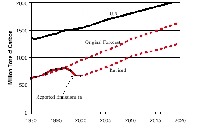 L’exemple de la Chine est très révélateur d’une certaine démagogie de l’argumentation américaine concernant les pays en voie de développement. En effet, la Chine a réduit ses émissions dans une fourchette de 6 à 14% entre 1996 et 1999 (les estimations varient), malgré une croissance économique de 22 à 27% ; pendant ce temps-là , les émissions américaines augmentaient de 5%, pour une croissance moindre... Le graphique ci-dessous montre que les deux pays ont des comportements très différents : la Chine (en rouge : le pointillé du dessus correspond aux prévisions faites avant que soit constatée la réduction des dernières années) semble faire un effort substantiel pour réduire sa dépendance aux combustibles fossiles ; les USA, malgré tous leurs moyens technologiques, tirent prétexte de l’absence de contraintes imposées à Pékin pour continuer à brûler des combustibles fossiles à tire-larigot...