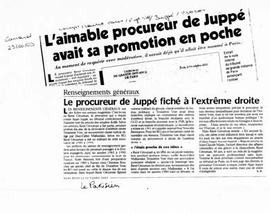 J’ai regardé dans un dossier de presse pour retrouver ses propos exacts. En octobre 2003, il est procureur au procès d’Alain Juppé dans l’affaire des emplois fictifs du RPR. Les journaux le surnomment « le procureur de Juppé ». Il a requis huit mois avec sursis contre l’ancien premier ministre et demandé au tribunal de Nanterre de ne pas lui infliger d’inéligibilité. A l’époque, cette mansuétude surprend - le tribunal condamnera Juppé à 18 mois avec sursis et dix ans d’inéligibilité. Dans les couloirs du Palais de justice, on s’interroge. On parle de Grouman tant et si bien, qu’un rapport des renseignements généraux refait surface à son sujet. Explosif. « Le procureur de Juppé fiché à l’extrême droite ». (...) On apprend aussi que le futur substitut avait coutume de se rendre aux cérémonies d’anniversaire de la mort de Franco en Espagne. Le Parisien vérifie auprès de l’intéressé. Et Grouman confirme. (...)