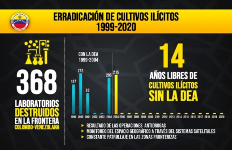 Depuis que la DEA est partie, il y a 14 ans ou un peu plus, nous n’avons plus de cultures illégales alors qu’en Colombie se cultive 169.000 hectares d’arbustes de coca. Le Venezuela ne compte plus aucune cultures illégales grâce à l’action permanente de surveillance de nos frontières.