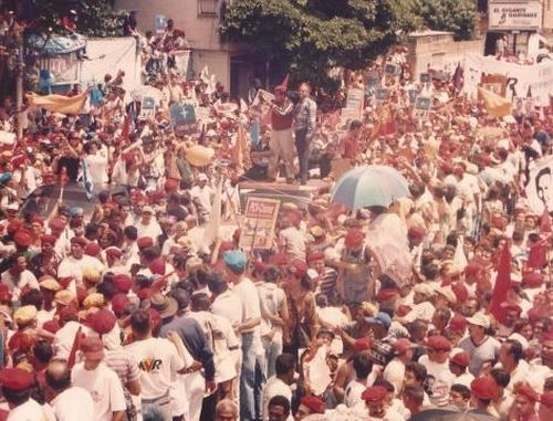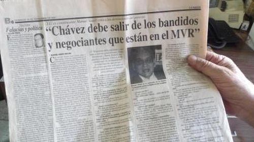 Manuel Vadell - En 1953. J’avais 17 ans, j’appartenais à la jeunesse d’un parti qui avait beaucoup promis au pays dans sa première étape : « Acción Democrática » (parti social-démocrate, NdT). Nos courants internes, à la gauche de AD, étaient emmenés par ce grand dirigeant que fut Domingo Alberto Rangel. Puis nous avons fondé le Mouvement de la Gauche Révolutionnaire (MIR). Ce fut le début d’un long travail qui a coûté beaucoup de martyrs au pays, non seulement sous la dictature de Pérez Jimenez mais par la suite sous la dictature des partis social-démocrate (AD) et démocrate-chrétien (COPEI). Il est frappant de voir que cette période civile fut beaucoup plus meurtrière que la dictature militaire. Tant de gens sacrifiés de manière absurde. En les assassinant, en les torturant, en les lançant depuis des avions. La lutte a continué : nous avons organisé tout le mouvement étudiant, celui de l’Université de Carabobo dans mon cas. J’ai subi 17 emprisonnements. Mes séjours en prison étaient brefs : j’étais président de la Fédération des Centres Universitaires et les rues se remplissaient pour exiger ma libération. Je dois dire avec fierté que j’ai inauguré la prison de Tocuyito ! (rire) M’y ont suivi 700 autres, venus de tous les coins du pays. Au milieu de tout cela, en plein appauvrissement généralisé du pays, Hugo Chavez tente une insurrection. Nous avions déjà des contacts avec lui. Lorsqu’il fut fait prisonnier après ce fameux 4 février 1992, les contacts se sont poursuivis à travers mes visites répétées à sa prison en compagnie du Dr. Giordani (actuel Ministre de la Planification NdT) ou de Domingo Alberto Rangel. Ici même, dans cette cave de la maison d’édition, nous nous sommes réunis après la libération de Chavez - Nicolas Maduro était parfois présent - pour structurer le MBR-200 civico-militaire, qui jusque là était une formation purement militaire. Chavez me nomma au sein de la direction avec - cela paraît incroyable - la responsabilité de la « sécurité et discipline ». C’est ainsi que nous nous sommes rapprochés.