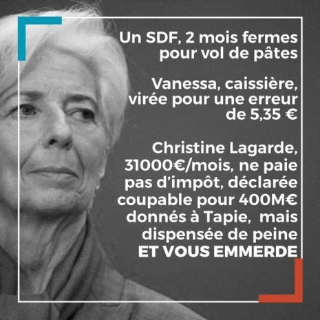 La Cour de justice de la République a rendu ce lundi 19 décembre son jugement dans l’affaire de l’arbitrage Tapie : l’ancienne ministre de Nicolas Sarkozy et actuelle directrice du Fonds monétaire international, Christine Lagarde est reconnue coupable mais reste dispensée de peine et son casier judiciaire reste vierge (!). Véritable prouesse, voire un non-sens juridique, cette sentence est définitive car il n’est pas possible de faire appel. Elle ne fait que confirmer une justice d’exception à l’égard des personnalités éminentes de l’État.