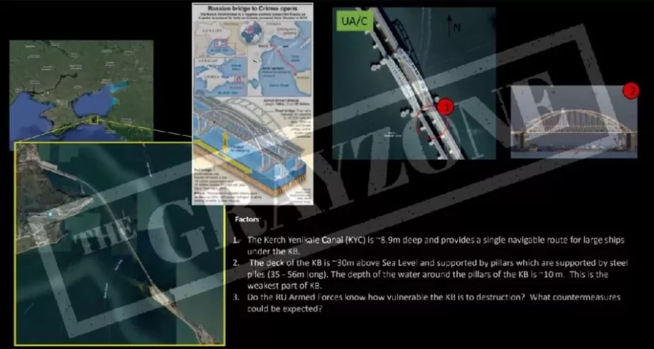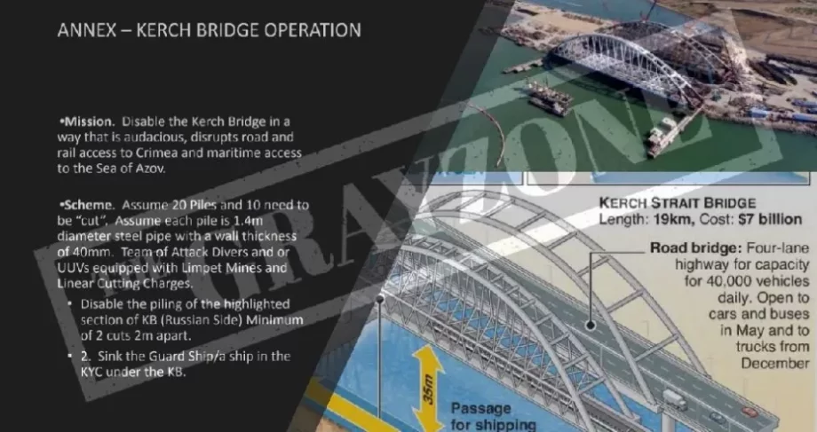 The Grayzone a obtenu une présentation datant d’avril 2022, rédigée à l’intention d’officiers supérieurs des services de renseignement britanniques, qui décrit un plan élaboré visant à faire sauter le pont de Kerch en Crimée avec la participation de soldats ukrainiens spécialement formés. Près de six mois après la diffusion du plan, le pont de Kerch a été attaqué lors d’un attentat suicide le 8 octobre, apparemment supervisé par les services de renseignement ukrainiens du SBU.