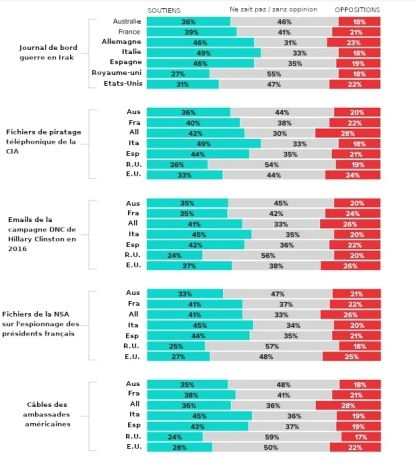 - L’absence d’opinion est la plus évidente au Royaume-Uni : Des majorités d’adultes britanniques ont déclaré ne pas avoir entendu parler de la publication des journaux de bord de la guerre en Irak, des fichiers de piratage téléphonique de la CIA, des courriels de campagne de l’ancienne candidate à la présidence Hillary Clinton en 2016, des fichiers concernant l’espionnage des présidents français ou des millions de câbles des ambassades américaines de 1973 à 2010.