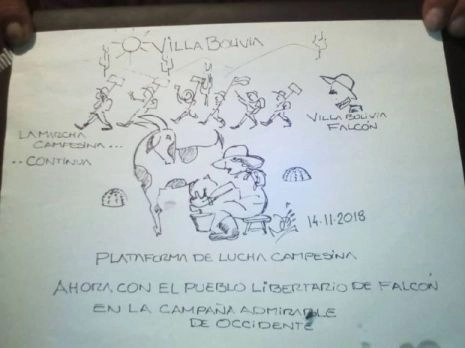Les délégués de la Marche Paysanne Admirable arrivent dans l’état de Falcón, le 11 novembre 2018. Au centre, Arbonio Ortega (poing levé, lunettes et chemise blanche). Le portrait rappelle la lutte du ¨général des hommes et des terres libres », Ezequiel Zamora (1817-1860). A gauche, en chemise bleue et chapeau, le dessinateur paysan Bracamontes qui croque au jour le jour les épisodes de la marche… (photo ci-dessous).