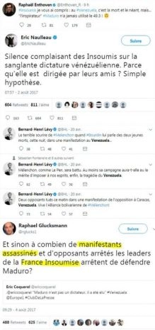 Au micro de la radio suisse RTS (07/07/2017), le même Maurice Lemoine s’insurge contre ces raccourcis médiatiques : « J’y suis allé pendant trois semaines [au Venezuela, ndlr]. Les manifestations de l’opposition sont extrêmement violentes, c’est-à-dire que vous avez une opposition qui défile de 10h du matin jusqu’à 1h de l’après-midi et, ensuite, elle est remplacée par des groupes de choc de l’extrême-droite avec des délinquants. […] Ils sont très équipés et c’est une violence qui n’a strictement rien à avoir avec les manifestations que nous avons ici en Europe. On vous dit « répression des manifestations au Venezuela, 90 morts ». C’est pas vrai ! C’est pas vrai ! […] En tant que journaliste, je m’insurge et je suis très en colère. Dans les 90 morts, vous avez 8 policiers et gardes nationaux qui ont été tués par balle. Vous avez, la semaine dernière, deux jeunes manifestants qui se sont fait péter avec des explosifs artisanaux. Vous avez des gens, des chavistes, qui essayent de passer une barricade et qui sont tués par balle, c’est-à-dire que la majorité des victimes ne sont pas des opposants tués par les forces de l’ordre et, y compris dans les cas – parce qu’il y en a eu – de grosses bavures et de manifestants qui sont victimes des forces de l’ordre, les gardes nationaux ou les policiers sont actuellement entre les mains de la justice. Il y a une présentation du phénomène qui, de mon point de vue de journaliste, est très manipulatrice. »