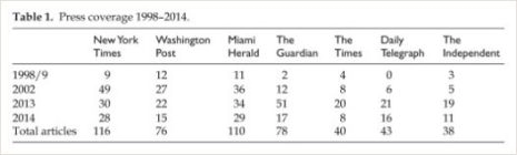 Afin d’explorer la question de savoir comment les médias internationaux dépeignent la société civile vénézuélienne ; qui en fait partie et qui en est exclue, un échantillon de sept publications occidentales, de premier plan, tiré des bases de données Nexus et NewsBank de tous les articles,de plus de 400 mots, contenant le mot ‘Venezuela’ dans le texte. Il s’agit des journaux The New York Times, The Washington Post, The Miami Herald, The Guardian, The Independent, The Times (Londres) et The Daily Telegraph. (voir tableau 1). Les dates choisies sont celles de pics médiatiques. Il s’agit de l’élection et de l’investiture de Chavez en 1998/9, de la tentative de coup d’Etat de 2002, de la mort de Chavez en 2013, de l’élection de Nicolas Maduro en 2013 et des manifestations de 2014. Le Miami Herald produisant beaucoup d’articles sur le sujet, l’analyse des publications, fu réduite, afin d’éviter qu’il ne domine l’échantillon.